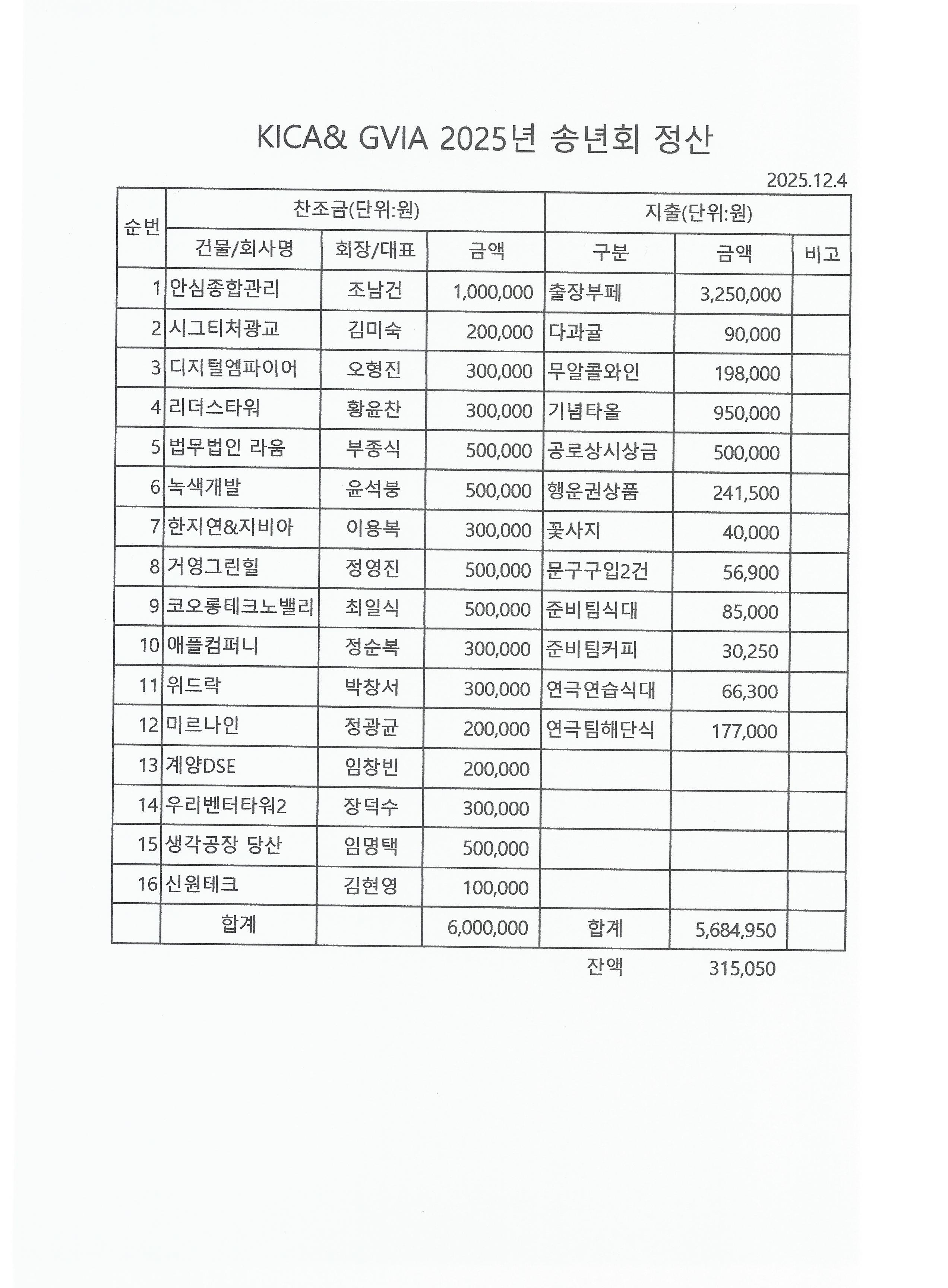 1.송년회 정산(찬조6,000,000원-지출5,684,950원=315,052원)은 붙임과 같습니다. 아껴써서 남은 금액 315,052원은 KICA & GVIA 운영자금으로 사용하겠습니다.