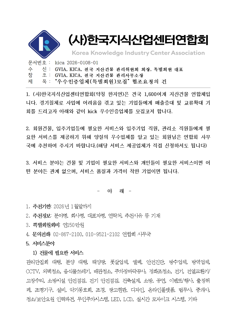 2026년 한지연 kica 우수인증업체(특별회원)를 모집하오니,